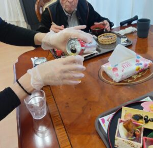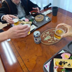 看護師の見守りのもと、ご希望の方にはビールやノンアルコールビールが振る舞われ、乾杯の声とともに食堂は一気にお正月ムードに包まれました。