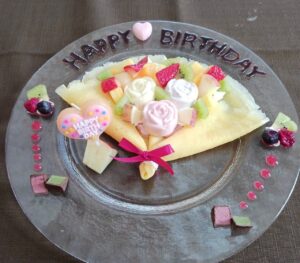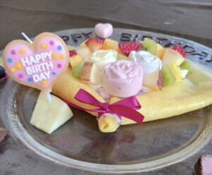 今回のお誕生日のケーキは、花束をイメージしてクレープで作ってみました。