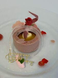 ソースの上に浮かべているのは、ハート型のマンゴーのレアチーズ