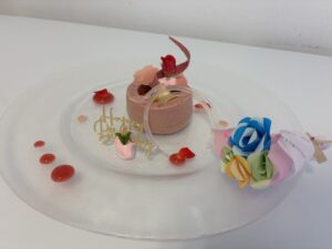 曲線の飴細工とルビーチョコレートの細工にベルローズを添えて
